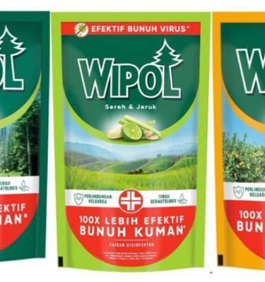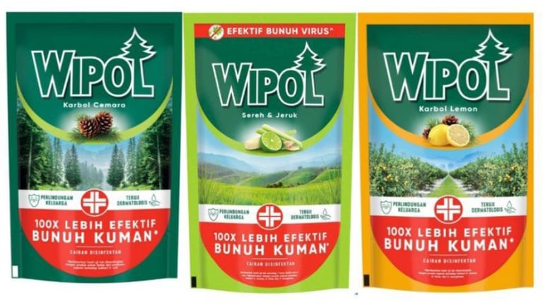 Wipol diformulasikan khusus dengan Pine Action untuk memberikan lima manfaat sekaligus, yaitu secara efektif membunuh kuman (diklaim 100x lebih efektif dari pembersih biasa), menjadikan lantai bersih dan kesat, serta ampuh menghilangkan bau tak sedap dari berbagai sumber seperti kamar mandi, WC, got, hingga kandang binatang. Wipol hadir dalam berbagai varian aroma khas, seperti Cemara dan Lemon Pine, yang memberikan keharuman segar yang tahan lama di seluruh ruangan, sekaligus berfungsi ganda sebagai disinfektan untuk perlindungan higienis keluarga.